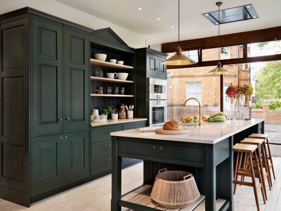 Имеет несколько оттенков и делает помещение визуально более светлым. Благодаря ему есть возможность создать монохромный интерьер в прованском стиле, олицетворяющий заливные луга и ранее лето, при этом кухня не будет казаться одним зеленым пятном.