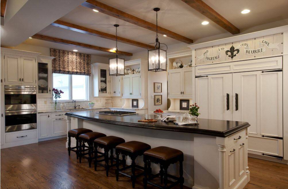 Стены должны иметь гладкую структуру. С этой целью их белят, красят водоэмульсионной краской или обшивают обработанной доской. Оригинально будут выглядеть вставки из плитки или камня. Для воссоздания идеальной картины сельских мотивов потолок украшается деревянными балками. Наличие современных пластиковых панелей или винила может испортить эффект. В виде напольного покрытия можно использовать паркетную доску, ламинат, крупную плитку из искусственного камня с матовой поверхностью.
