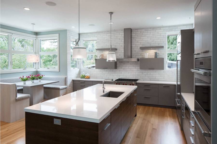 Например, прямые кухонные гарнитуры, небольшие барные стойки в качестве обеденной зоны для 2-3 человек.