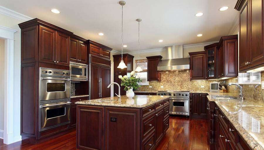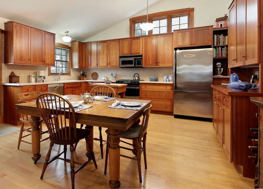 Так, для отделки пола и стен можно использовать камень, керамогранит или привычную для строителей древесину. Если вы хотите сделать атмосферу на кухне более теплой, то выбор необходимо сделать в пользу дерева, а если более солидной, то тогда камень. Лучше всего, если все шкафы будут также выполнены исключительно из натурального дерева.