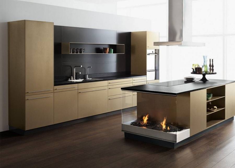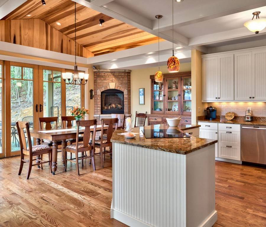 - В кухне частного дома можно поместить камин, придающий уют и величие помещению. Этот вариант идеально подходит для кухонь, в которых находятся печи для отопления дома.