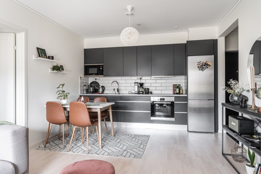 Если не удается встроить холодильник, его лучше расположить в свободном углу. Например, при линейной планировке мебели прибор устанавливают в углу, смежном со стеной, в которой находится дверной проем или арка.
