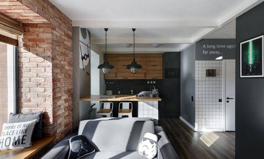 Изначально чердачный стиль. Для него характерна некая небрежность и присутствие урбанистических деталей. Например, часто можно встретить перекрытие одной стены декоративным кирпичом или досками. Такое решение создаст ощущение того, что квартира имеет открытый доступ вод двор, что сделает ее существенно свежее и просторнее.