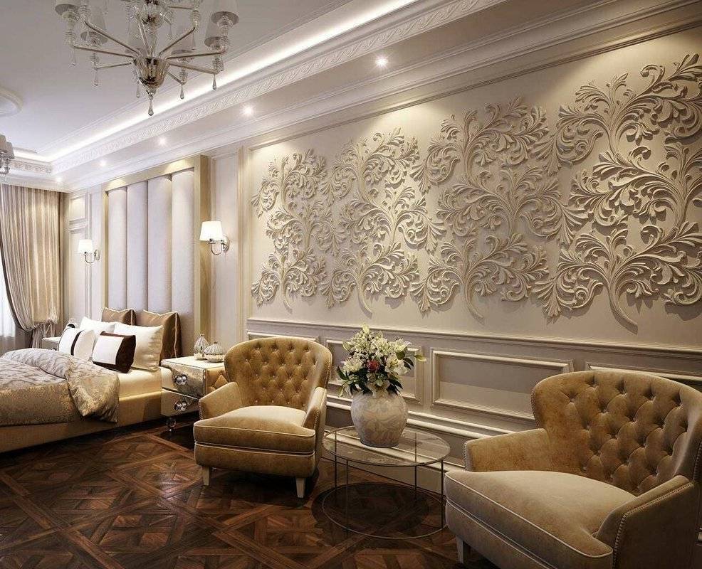 Классической базой декора всегда являлись лепнина из гипса, карнизы и молдинги. Им отведена роль парадного вида социальной зоны в квартире – пусть это будет пространство коридора, совмещённых гостиной-кухни-столовой, а также детского и взрослого блоков.