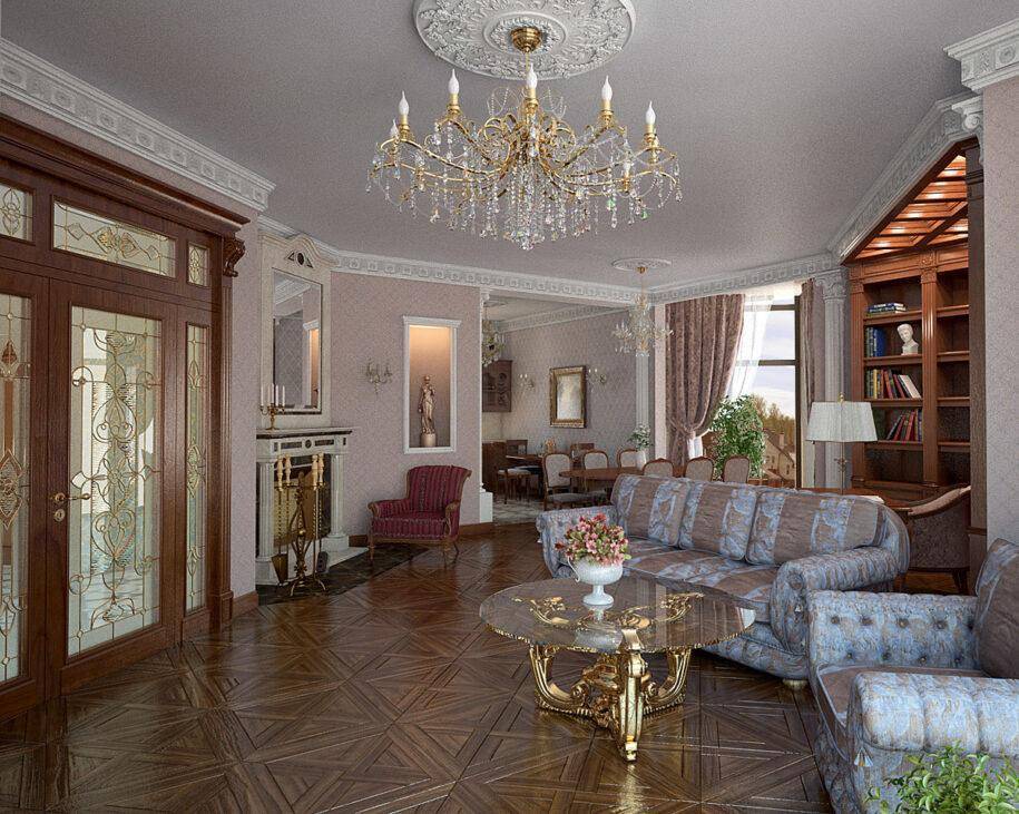 Облегченный классический стиль отлично подойдет для интерьера небольшой гостиной в доме или квартире. Для оформления в стиле неоклассика, подберите красивую, дорогую мебель в современном стиле песочных, коричневых, бежевых или серых тонов, легкие шкафы или полки из светлого дерева, подвесные изящные светильники, шторы молочного цвета, журнальные столики на резных ножках, картины и прозрачные вазы обтекаемых форм.