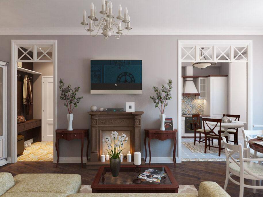 В проект оформления отлично впишется электрический камин, телевизор, напольные вазы, торшеры. Для внутренней отделки можно использовать обои с нейтральным рисунком.