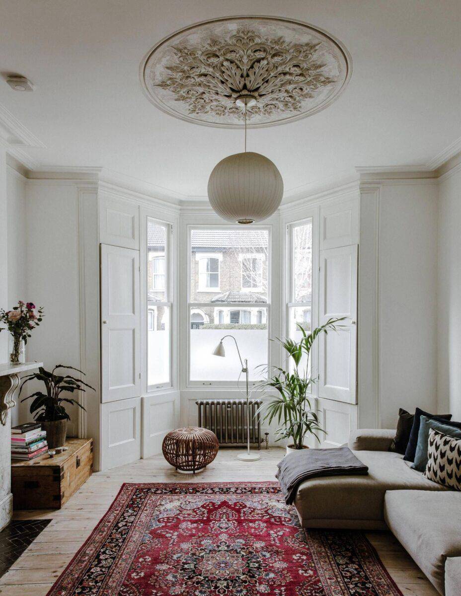 Один из самых популярных стилей идеально подходит для комнат с любым количеством кв м. Здесь приветствуются яркие акценты на нейтральном фоне, полностью белые стены и потолок, светлый пол, узорчатый ковер и диванные подушки, отсутствие штор на окнах, необычные картины и аксессуары, модульная мебель.