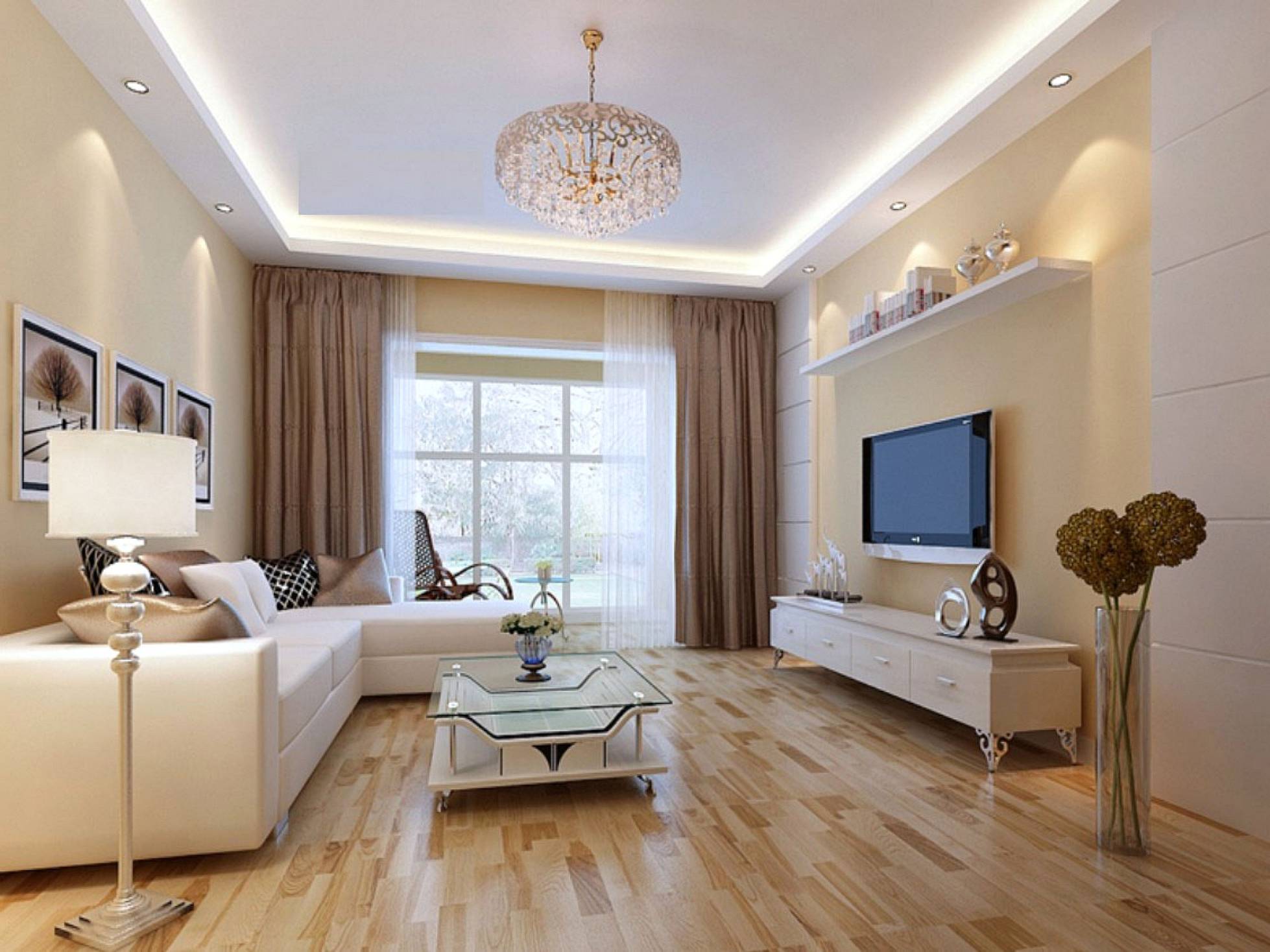Небольшие по габаритам комнаты необходимо зрительно сделать просторнее. Поэтому чаще всего здесь используются светлые тона, которые хорошо справляются с задачей расширения пространства. Пастельная, бежевая палитра отделки в сочетании со светлой мебелью и стеклянными аксессуарами делает гостиную легкой и светлой.