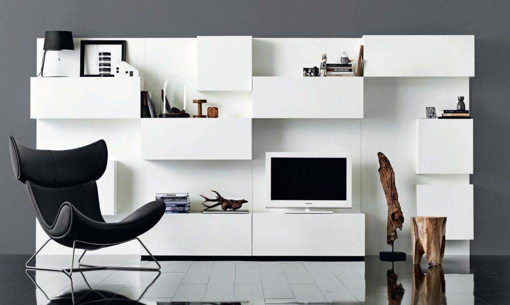 Из-за небольших размеров зала, не обязательно отказываться от использования стенок или же шкафов в интерьере. Необходимо правильно выбрать модели подобных конструкций и комната станет современной и уютной.