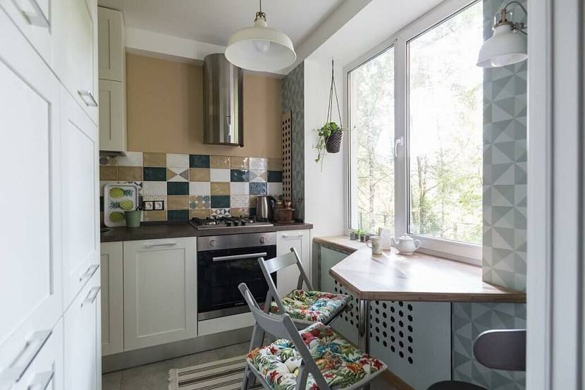 - Вместо подоконника установите столешницу – это поможет освободить место под стеной для мебели. Она будет одновременно и рабочей поверхностью, и обеденным столом.