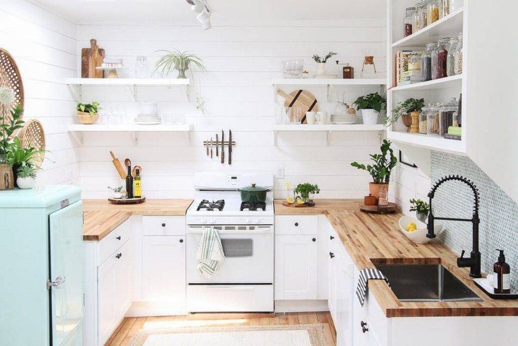 Изменение цвета вашей кухни-это недорогое, простое обновление, которое сразу же сделает пространство больше. Белые кухни находятся в тренде, и это лучший цвет для визуального открытия пространства. Если вы хотите пойти на что-то более яркое, желтый может создать гостеприимную, солнечную кухню. Зеленый-это цвет, который символизирует природный мир и спокойствие. Бледно-зеленый и бирюзовый-это трендовые оттенки и идеальные цвета для добавления штрихов к белой кухне. Дополните этот образ нежными зелеными растениями или цветочными композициями.