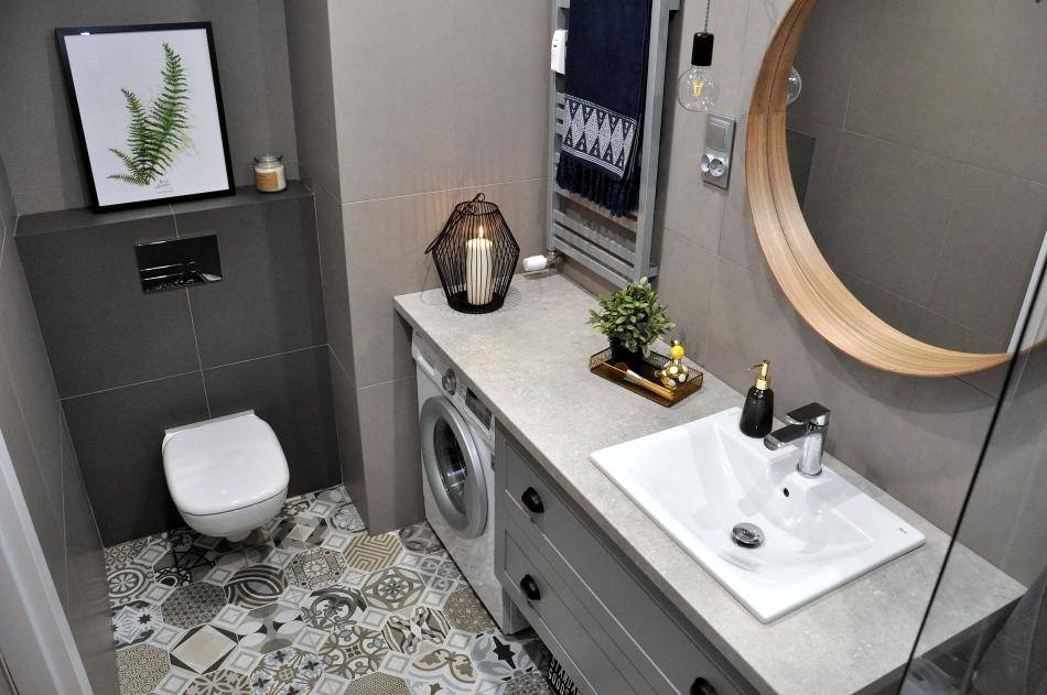 Следующий этап: стиральная машина и бельевая корзина. Стереотип про машину с верхней загрузкой держался долго, но для маленькой ванной больше подходит машина с боковой загрузкой. Потому что на ее сверху можно что-то поставить или саму машинку под что-то спрятать.