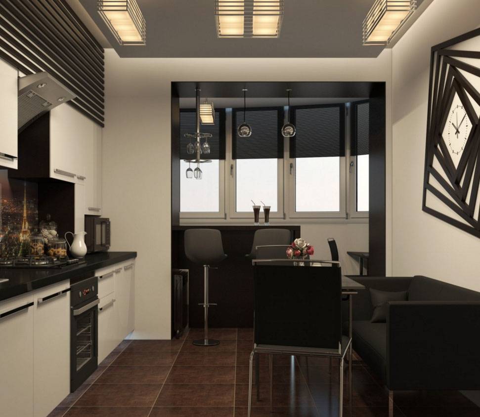 Дизайн кухни. Для того чтоб нормально существовать в расширенной за счет балкона кухне нужно позаботиться об его утеплении – это обязательно двухкамерные окна ПВХ, теплый пол, утепленный потолок и стены. Иногда бывает так, что каменный простенок под оконной рамой убирать не разрешают и выносить отопление на балкон так же, тогда этот монолитный простенок можно приспособить под барную стойку, а стулья вынести на сторону балкона, это существенно сэкономит пространство на кухне.