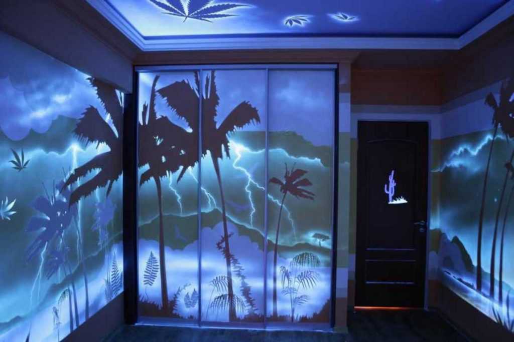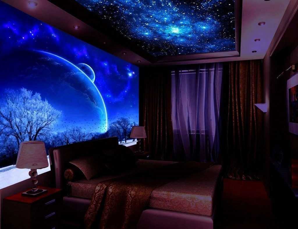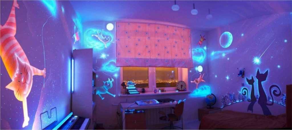 Выбирая дизайн стильных обоев с фосфорицирующими элементами, необходимо учитывать, что в комнате должно быть соответствующее освещение.