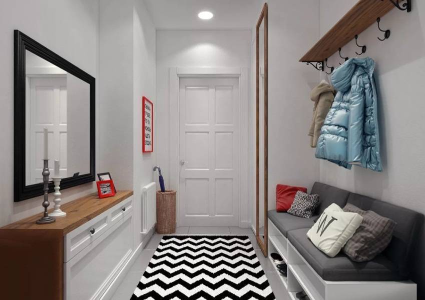 Дневной свет почти не будет попадать в прихожую, поэтому придётся продумать освещение и выбрать светлую отделку.