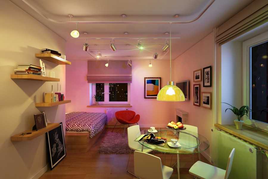 - В однокомнатной квартире площадью 30-40 м. кв. требуется не больше восьми световых приборов (например, потолочные светильники – 3, люстра – 1, бра – 2, торшер – 1, настольная лампа — 1);
