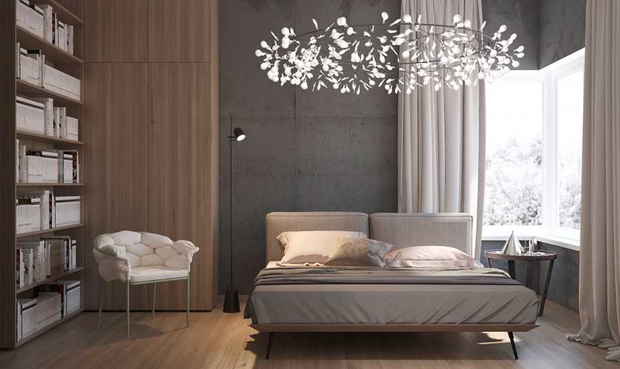 Здесь уместно использовать светильник с матовым плафоном или короткую люстру (100-150 Вт). У изголовья кровати с двух сторон размещают бра (60-100 Вт).