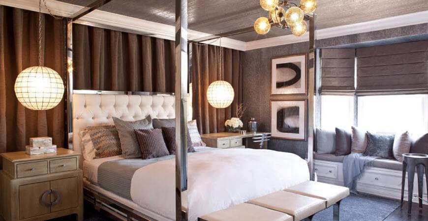 Спальни и гостиничные номера. Помимо потолочных светильников в спальных помещениях должны присутствовать локальные осветительные приборы. Настенные бра в прикроватной зоне, торшеры и настольные светильники создают интимный полумрак и используются для чтения в темное время суток.