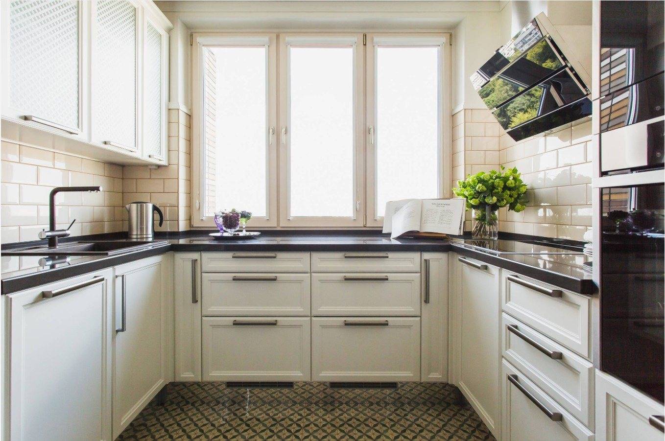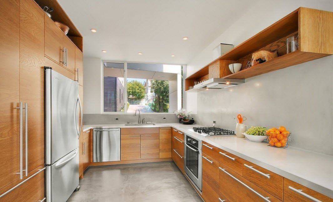 Очень популярная процедура на таких кухнях — поставить раковину под окном. Чтобы сохранить правильную эргономику, стоит разместить холодильник и плиту в боковые ряды шкафов. Однако не забудьте отделить устройства в этой ситуации с рабочей поверхностью с минимальной длиной в 40 см. Если ваша кухня не слишком большая, откажитесь от неуклюжих подвесных настенных шкафов. Вместо этого используйте полки. В данной компоновке вам, безусловно, будет достаточно нижних шкафов для хорошей организации и хранения. Угловые шкафы, в которых можно использовать раздвижные корзины, позволяют максимально использовать пространство.