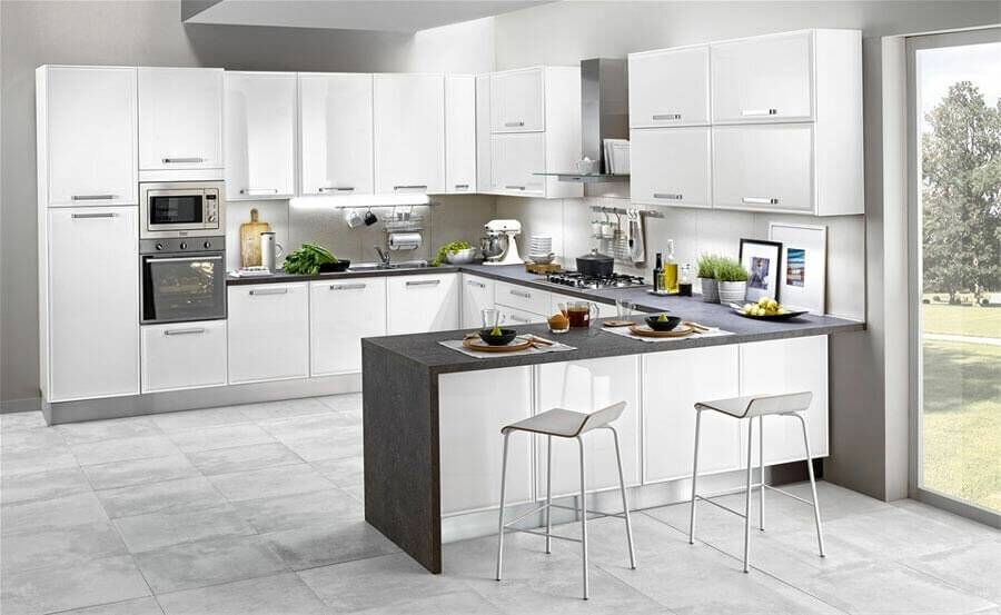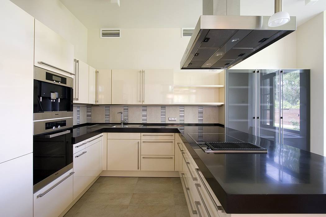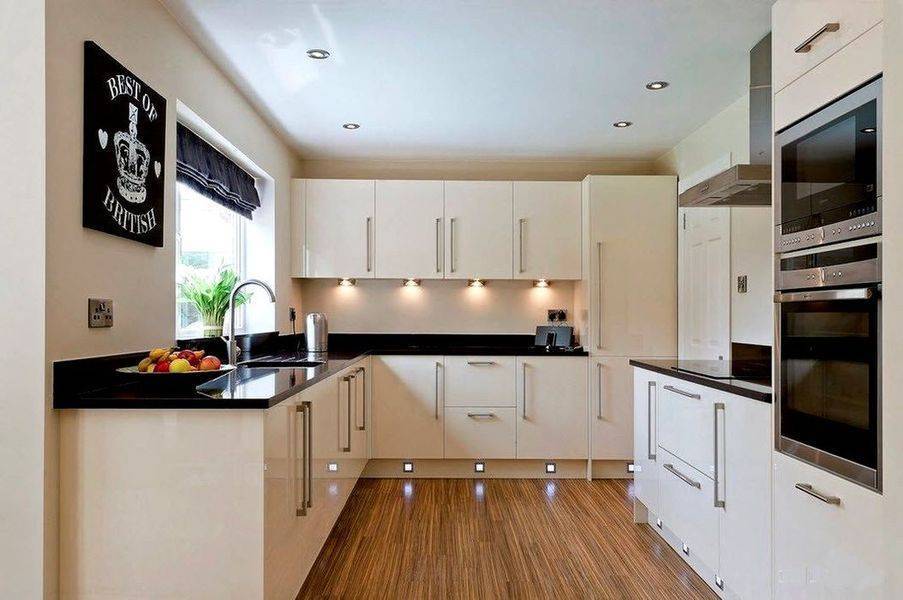 П-образная планировка хороша тем, что её можно реализовать практически в любых помещениях. Исключением являются вытянутые и очень узкие кухни, ширина которых не превышает 2,5 м. Но лучше всего этот вариант расстановки мебели подходит для большого пространства.