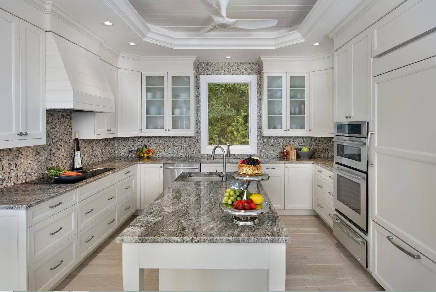 В интерьерах, оформленных в сдержанных традиционных мотивах, остров тоже уместен. Попробуйте сделать кухню в светлых тонах, с белыми фасадами и каменными столешницами. Изящная патина, элегантные детали смотрятся изумительно, особенно в таких масштабах.