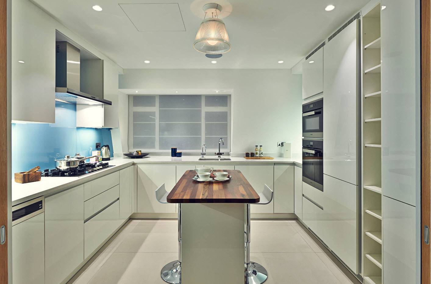 При таком варианте планировки мебель и бытовую технику расставляют по трём смежным стенам. Схематично это напоминает букву П. Боковой частью такой кухни может быть барная стойка или полуостров.