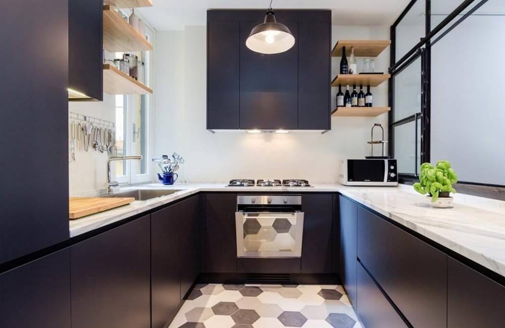 Первый тип может быть намного уже, поэтому здесь вам нужно соблюдать осторожность, чтобы поддерживать правильное расстояние между параллельными рядами столешниц. Оно не может быть меньше 90 см, хотя самое оптимальное расстояние — минимум 120 см