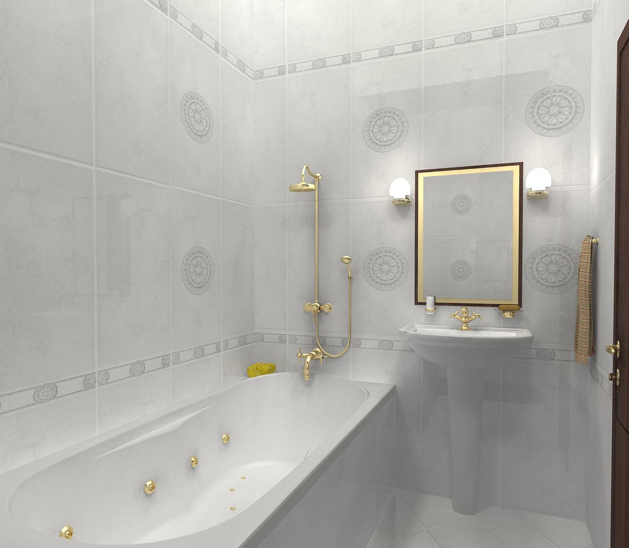 Кафель нарядного белого цвета лучше сочетать в маленьких ванных с другими цветами: