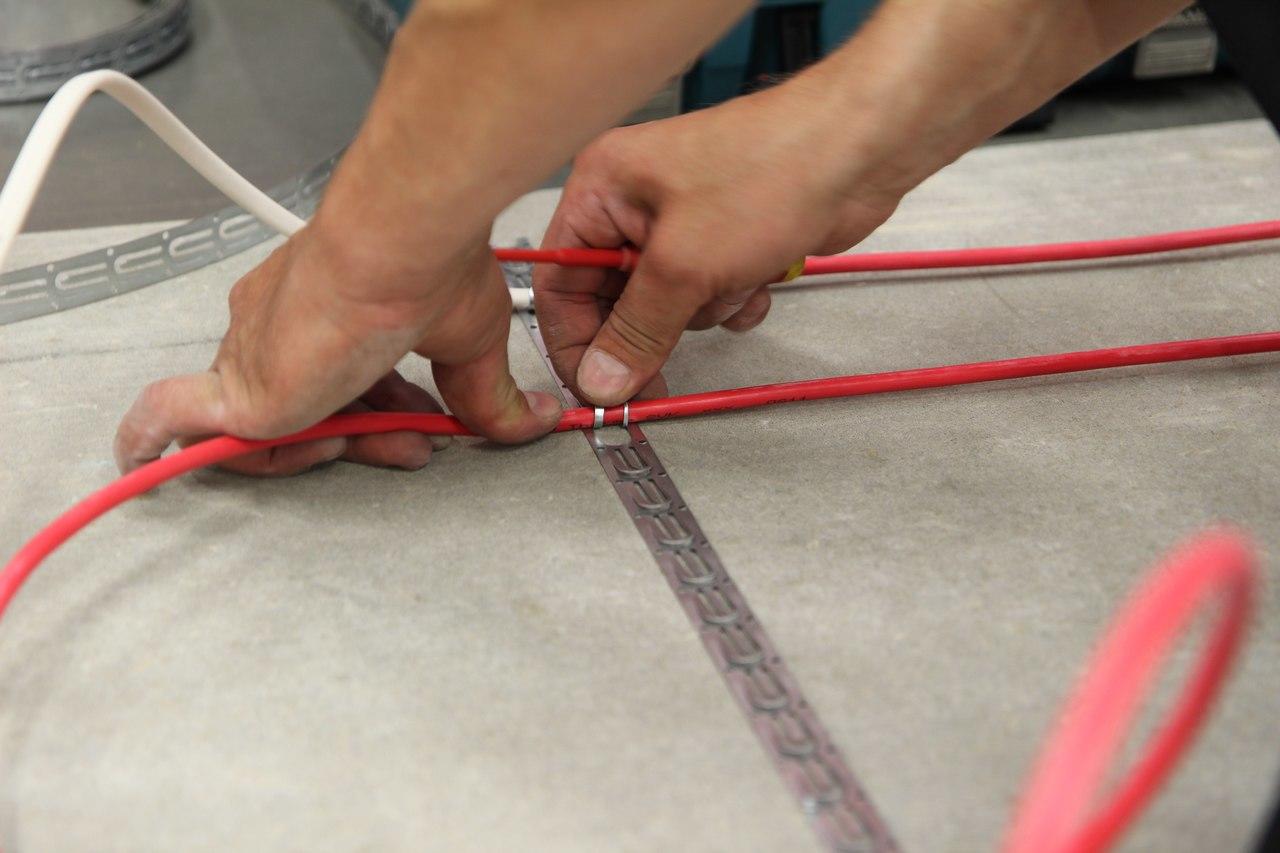 - Завершить укладку инфракрасной ленты, изолировать оголенные участки проводов, подключить терморегулятор и датчик;