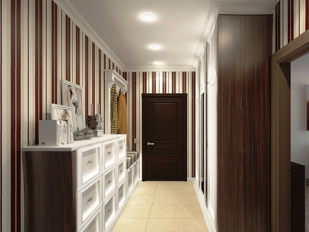 Узкое длинное пространство удобно разделить на функциональные зоны: у входа в квартиру и вестибюль. Использование разноуровневых потолков со встроенной подсветкой, цветовое решение зон, отделка позволят создать уютный интерьер в любом стиле.