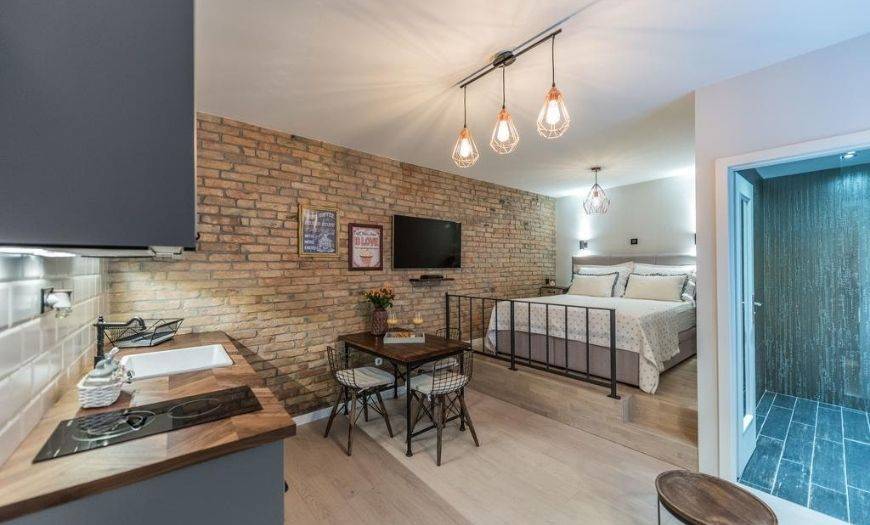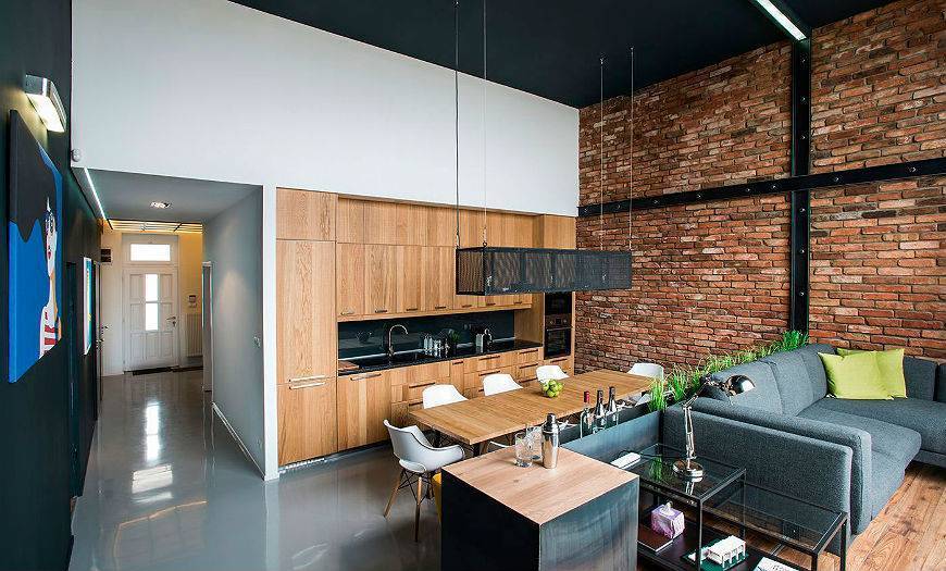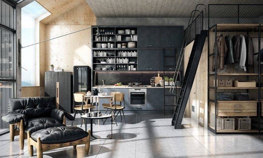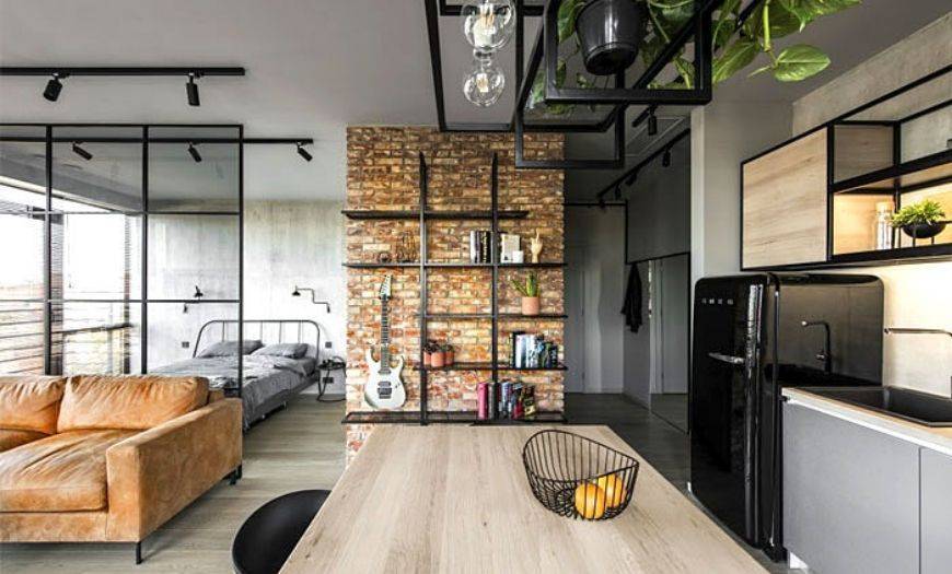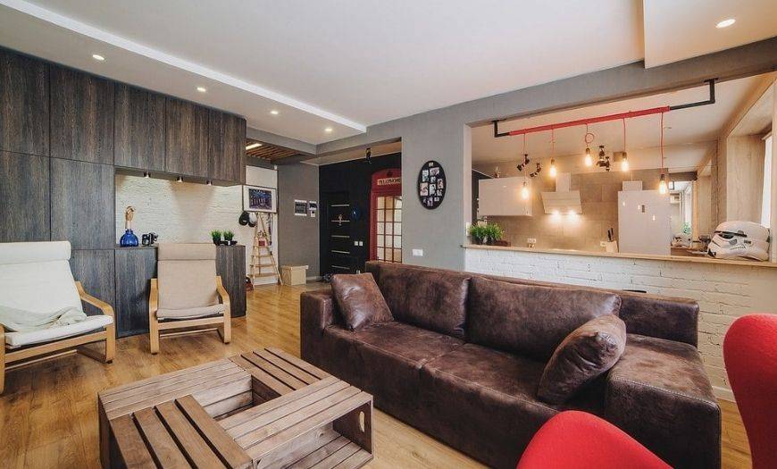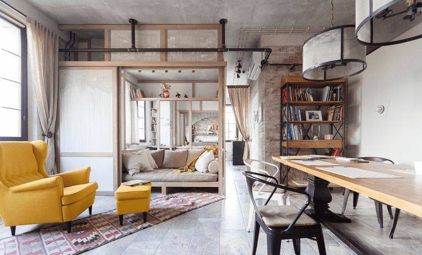 В этом стиле акцент делается на натуральности и практичности, граничащей с грубостью. Голые кирпичные стены со штукатуркой вместо обоев, прямые, простые формы в оформлении мебели и декора, изделия из необработанного дерева и камня — типичные особенности этого направления дизайна. Трубы и провода на стенах, открытые коммуникации — не пережиток неудачного ремонта, а оригинальные элементы декора, добавляющие интерьеру самобытности. Лофт лучше всего подходит для студии с большими окнами, т. к. в нем преобладают темные оттенки.