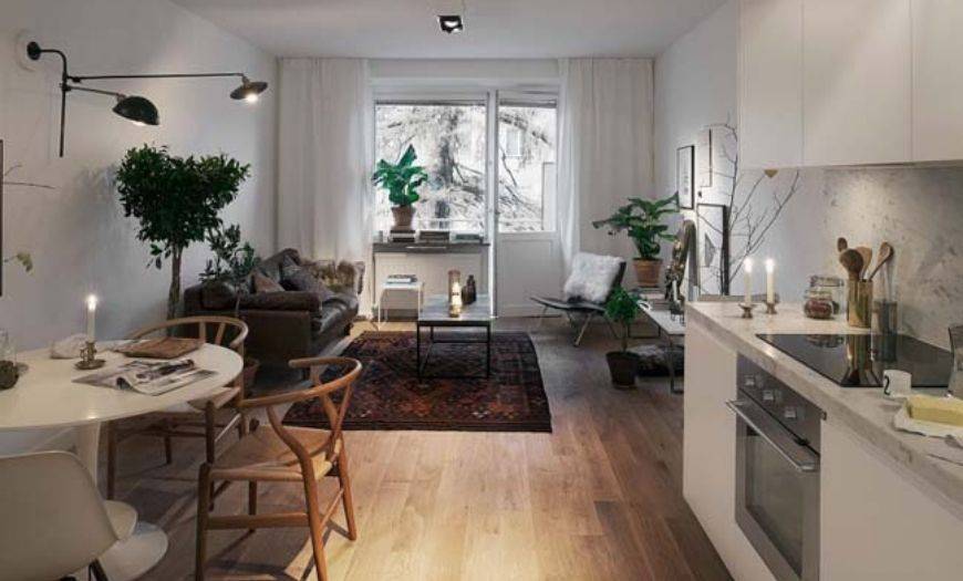 Использование данного стиля делает студию более светлой и просторной, поэтому он лучше всего подходит для маленьких квартир. Добавить интерьеру самобытности поможет заказная мебель из природных материалов, украшения из натурального камня и дерева, редкие комнатные растения.