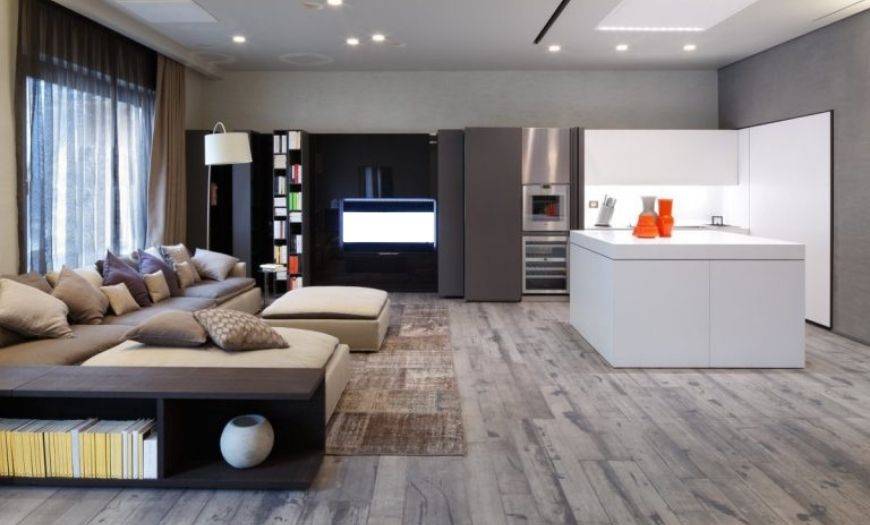 Потому что в квартире-студии нет дверей между комнатами, а значит стыковать разные напольные покрытия под дверьми не получится. А значит их выбор особенно важен.