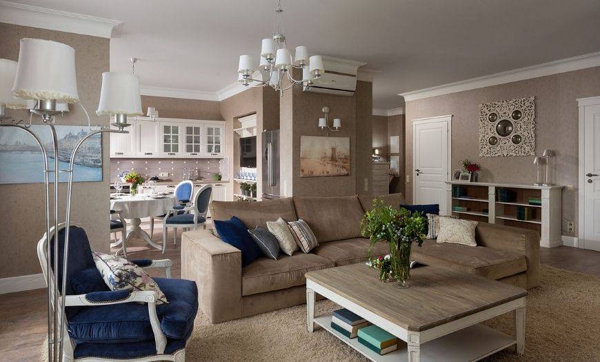 Стиль, соединяющий простоту и роскошь. Отличается использованием натуральных материалов, большим количеством текстиля, небольшой, но вычурной по форме мебелью и сантехникой. В квартире-студии создать удачный классический интерьер достаточно сложно. Рекомендуется использовать крупные принты, блестящие или хромированные элементы, зеркала, настенные украшения, текстиль для зонирования.