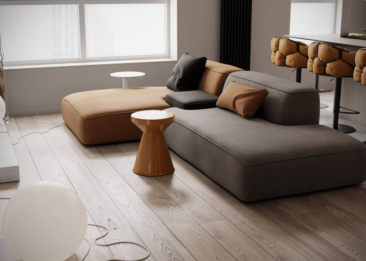 Планировка и дизайна двухуровневой квартиры в сдержанной цветовой гамме