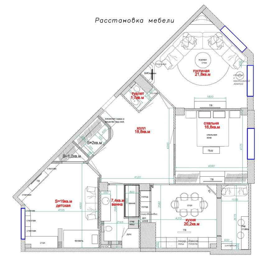 помещения с фактическими размерами и разработка вариантов планировочных решений. - План с расстановкой мебели.