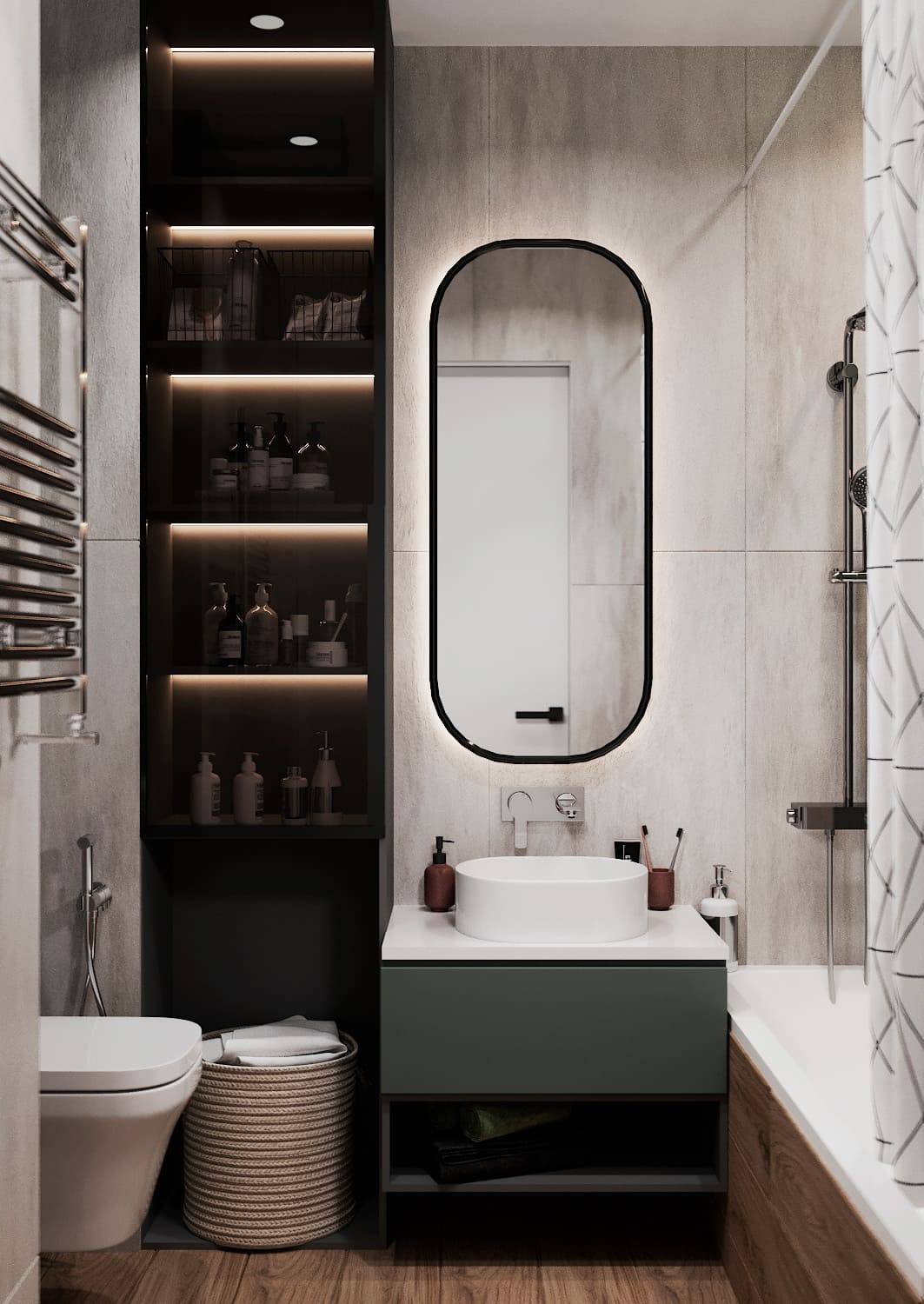 Визуализация будущего интерьера узкой ванной комнаты с душевой