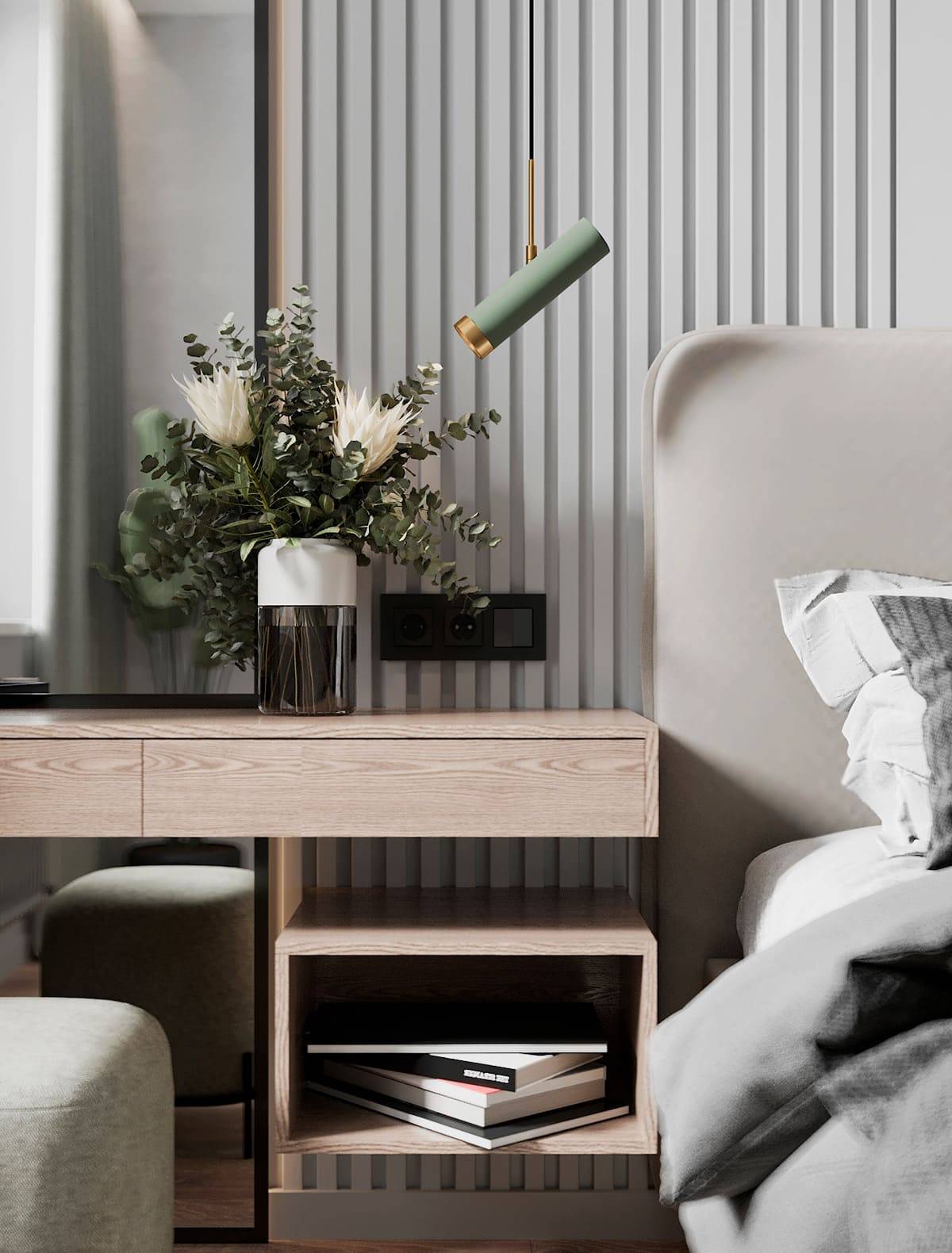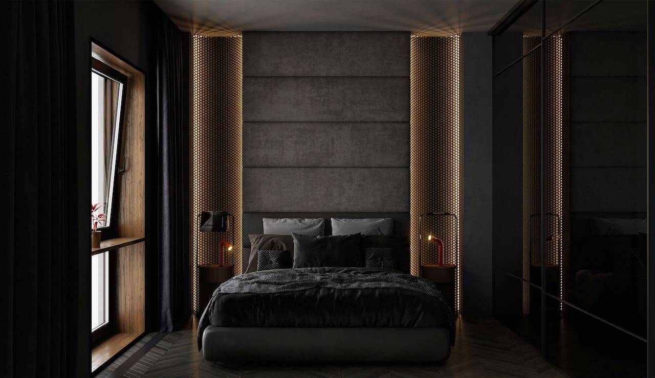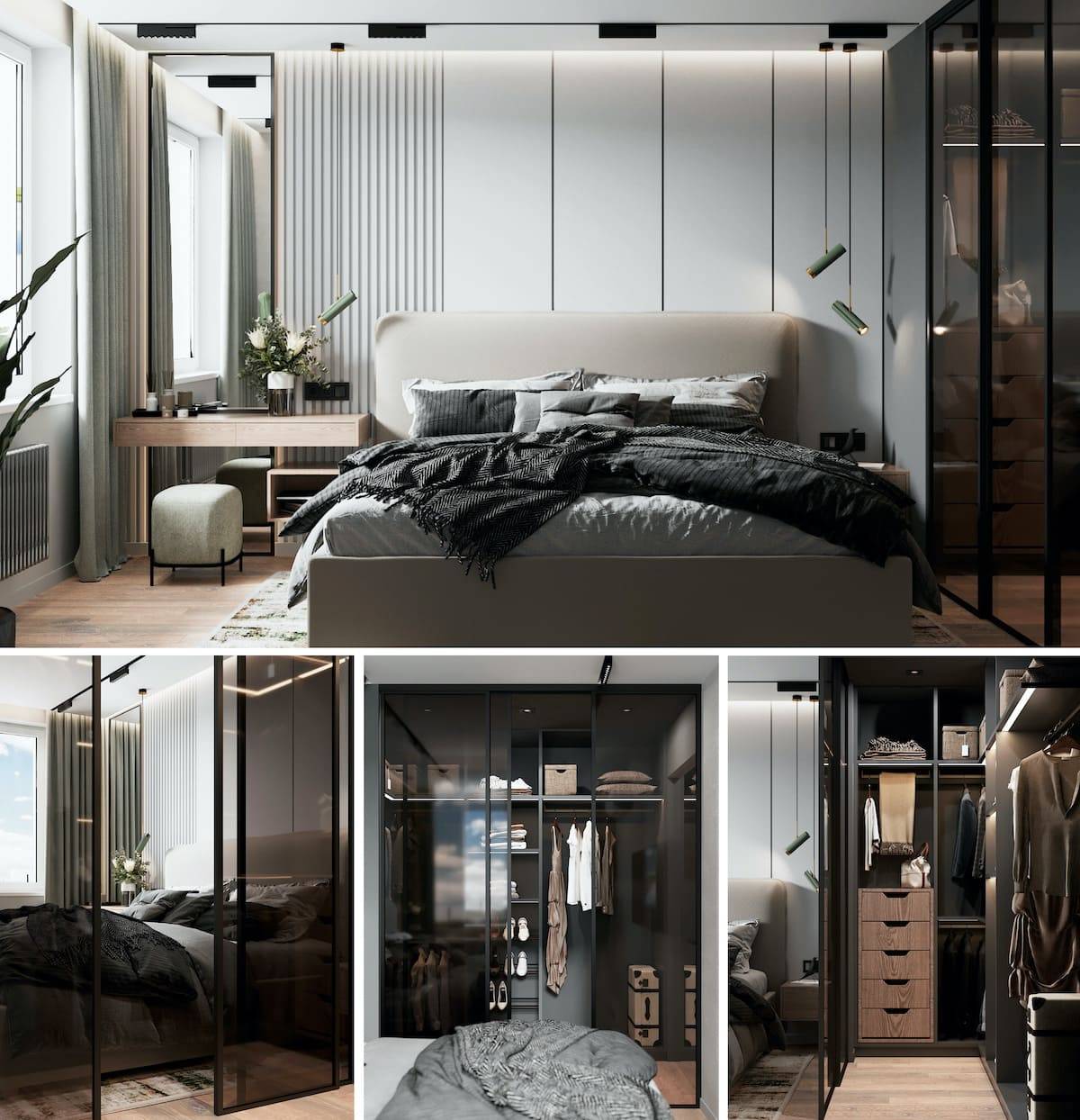 Визуализация спальни с облицовкой белым декоративным камнем в изголовье и полупрозрачной гардеробной в углу