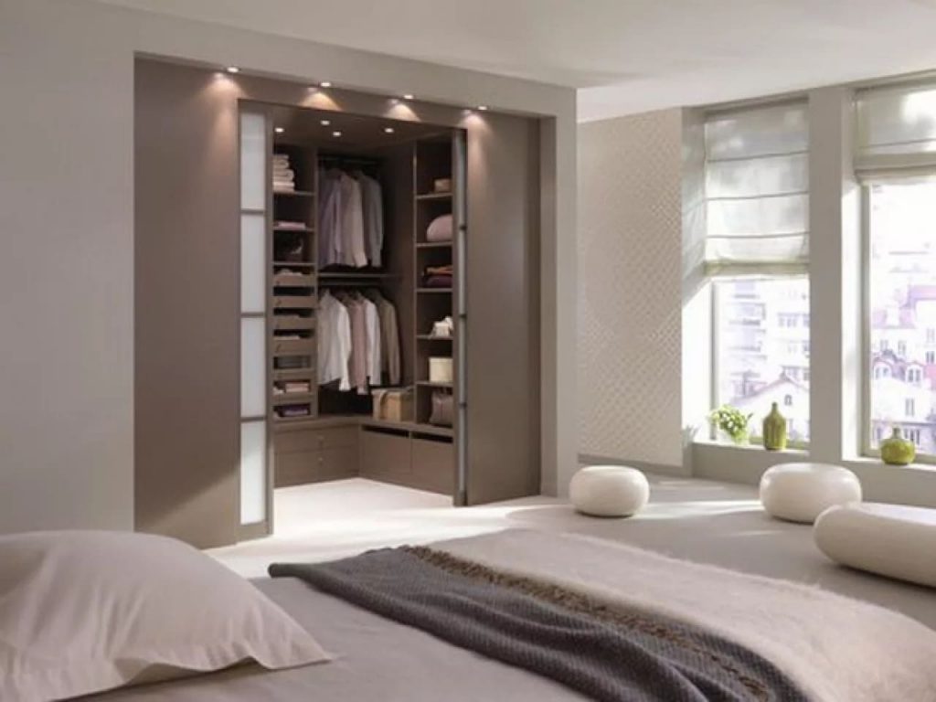 Гардеробную, как правило, делают закрытой. Стараются, чтобы ее фасад не привлекал к себе излишнего внимания. Подсветка чаще всего диодная. Располагается по всему периметру помещения.