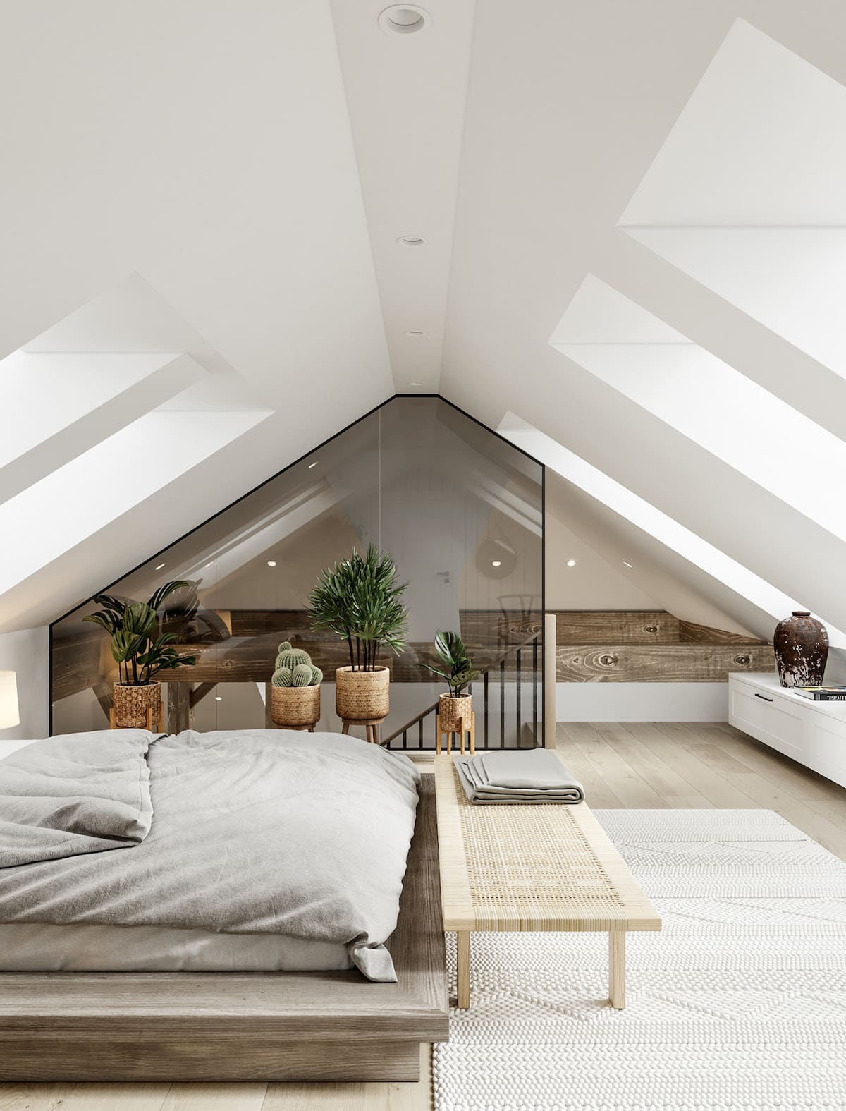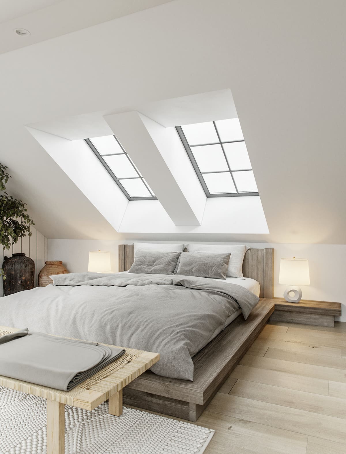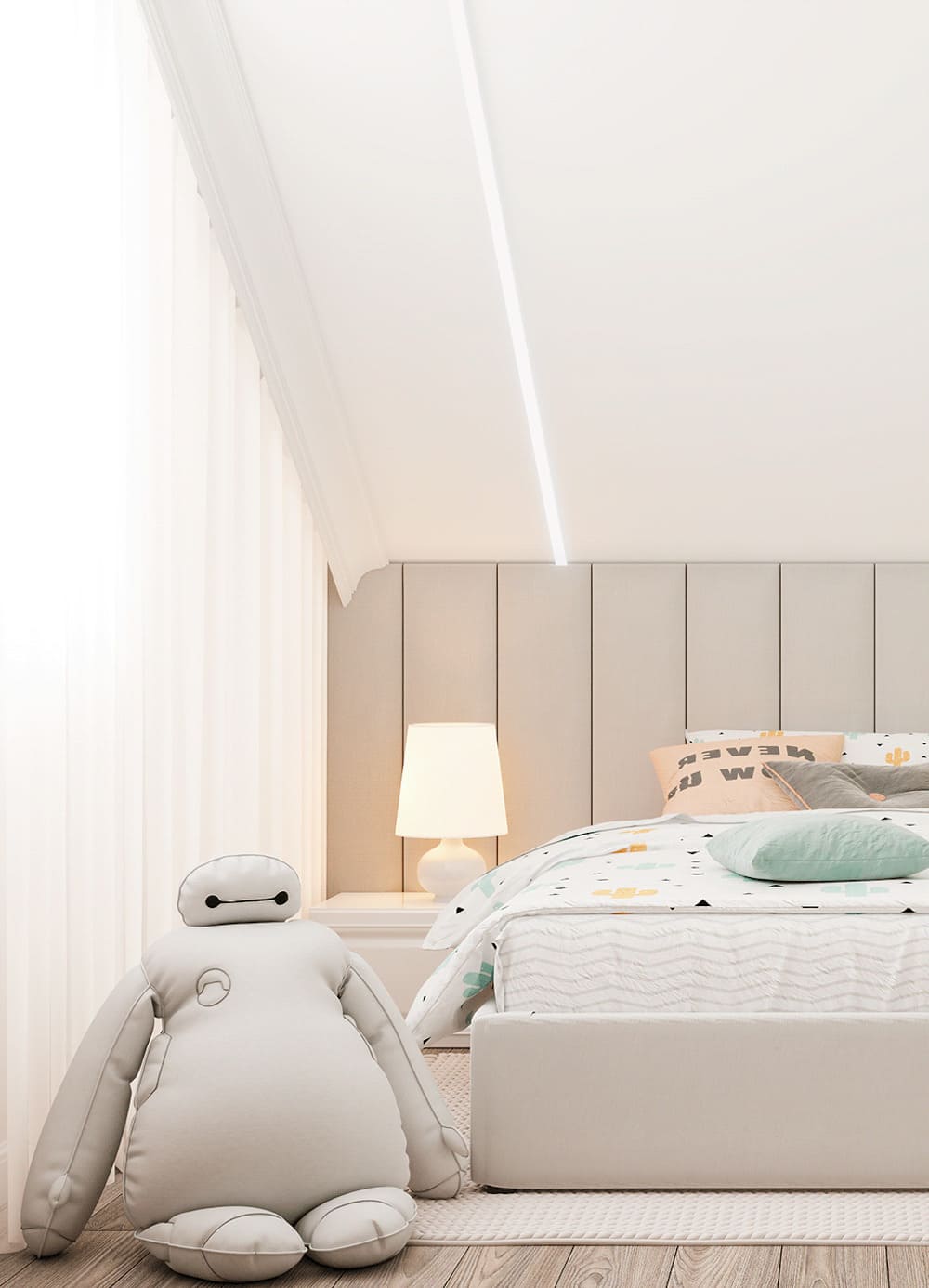 Просторная спальня на мансарде в светлых тонах