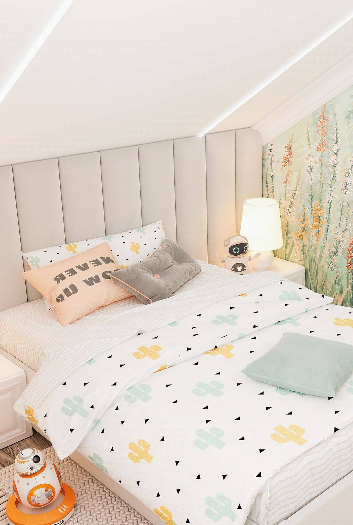 Сердцем каждой спальни станет удобная кровать. Определенно стоит выбирать спальное место, отталкиваясь от количества и роста пользователей. Небольшая мансардная спальня для ребенка может содержать малую односпальную кровать с декоративной рамой.