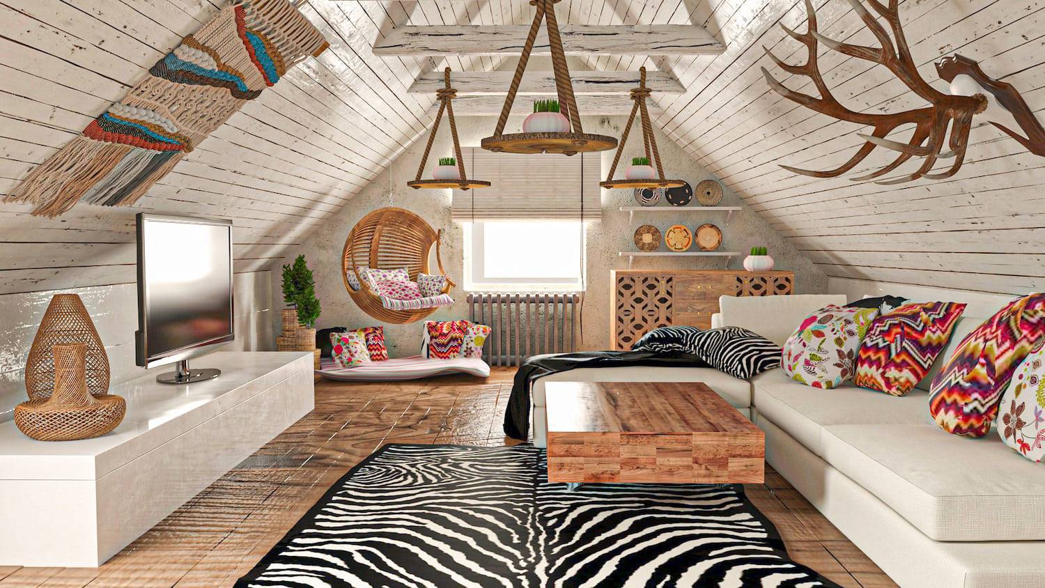 Мансарду на даче можно сделать в индийском, марокканском, африканском стиле. Все они настолько самобытные, что можно выбрать комбинированный вариант: украсить потолок яркими индийскими узорами, положить на кровать покрывало из Марокко, на стены повесить африканские маски, поставить кровать из массива дерева и столик из ротанга. Для всех этнических стилей характерна яркая цветовая палитра и использование натуральных материалов.