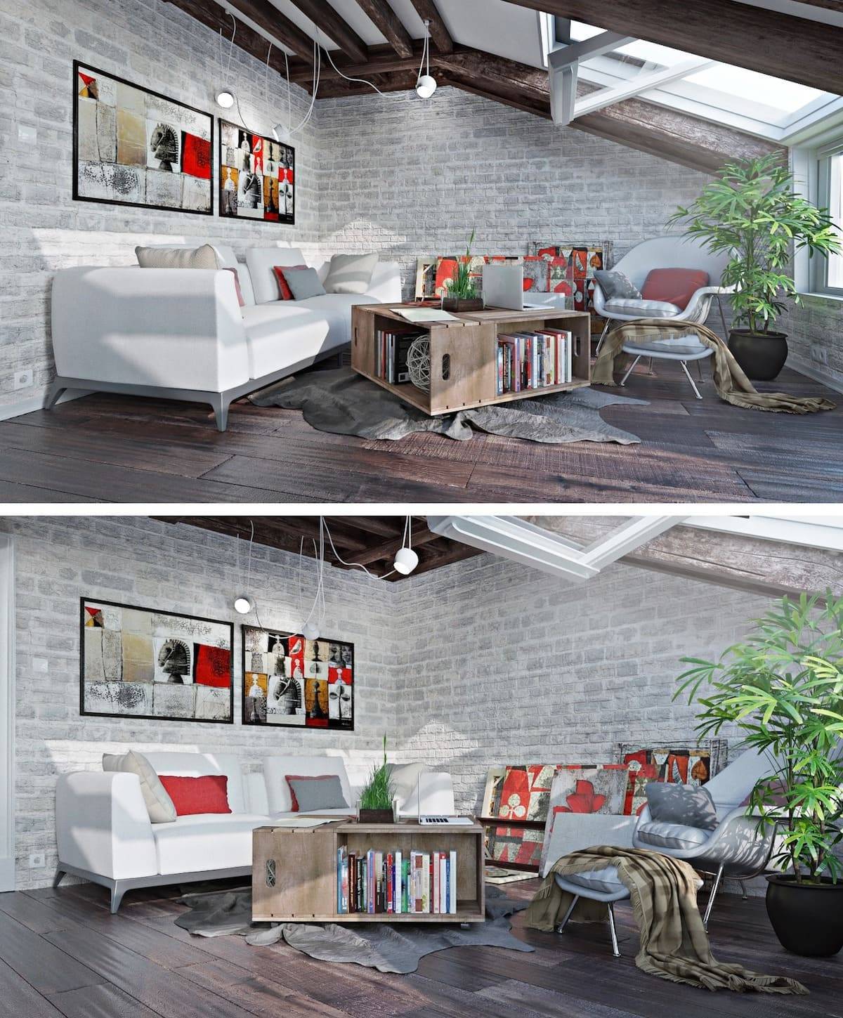 Для просторного помещения с большими оконными проемами используют темный пол. Если стены красят в серый цвет, то для мансарды выбирают мебель светлых тонов.