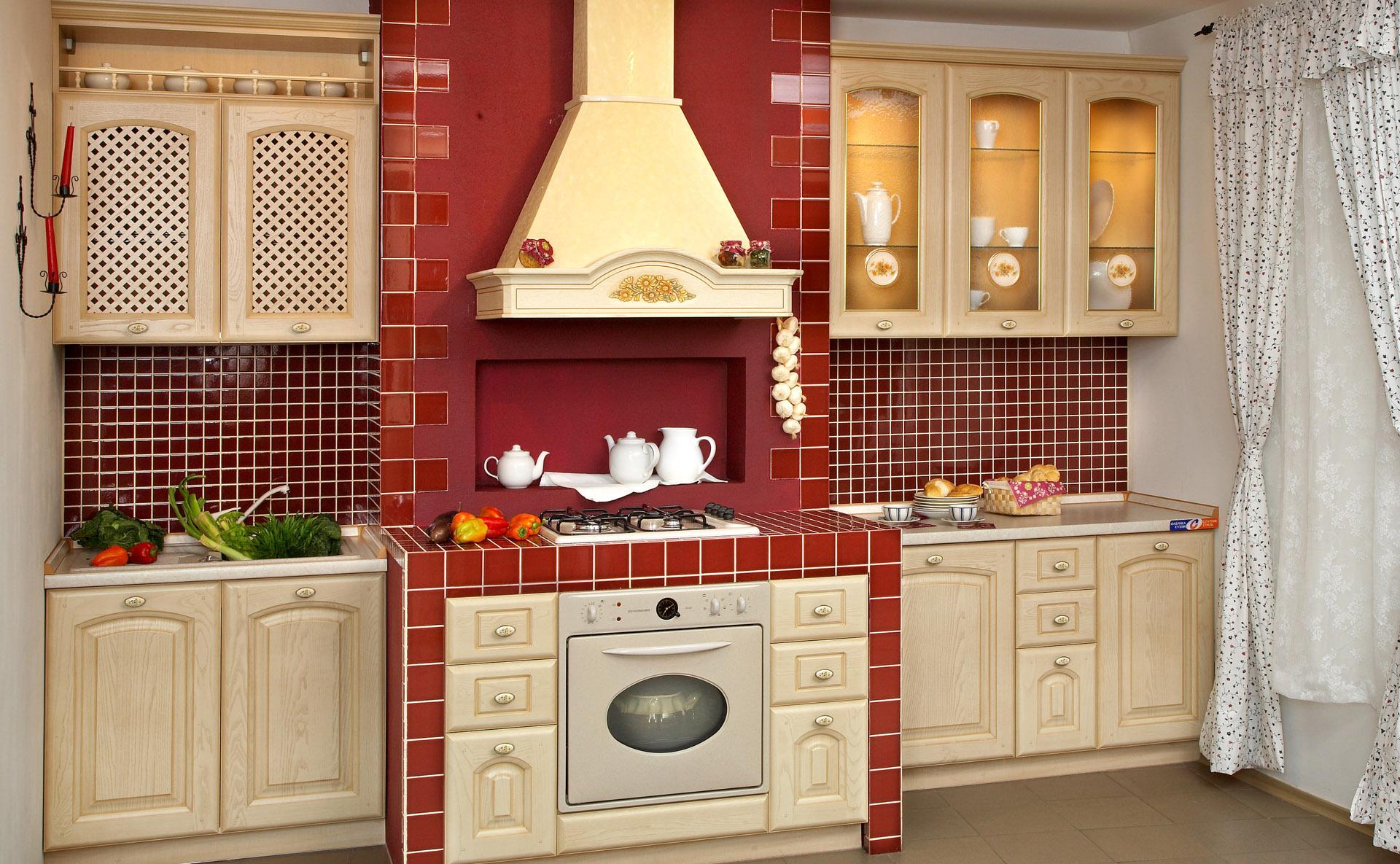 Кухня в стиле кантри в бежево-красных тонах