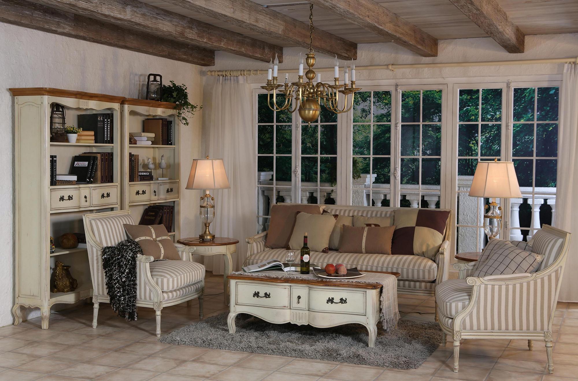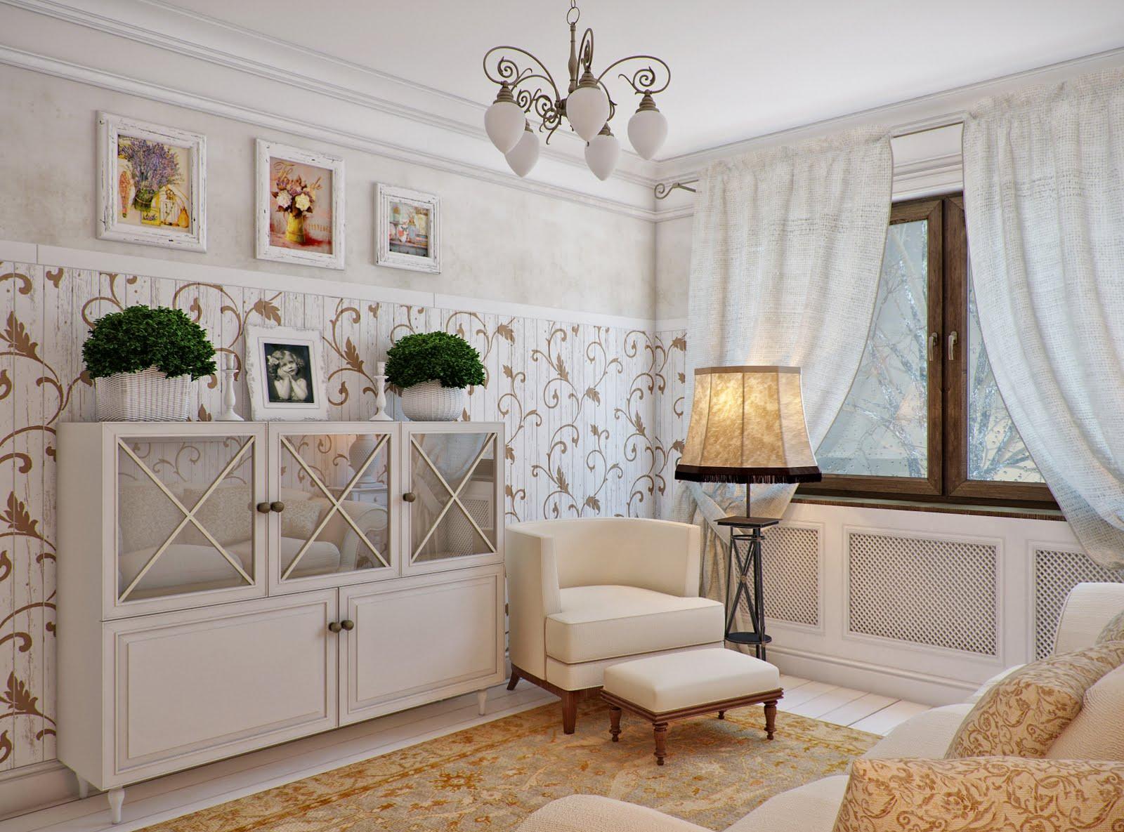 Бежевый, золотистый и белый цвета в интерьере гостиной в стиле прованс