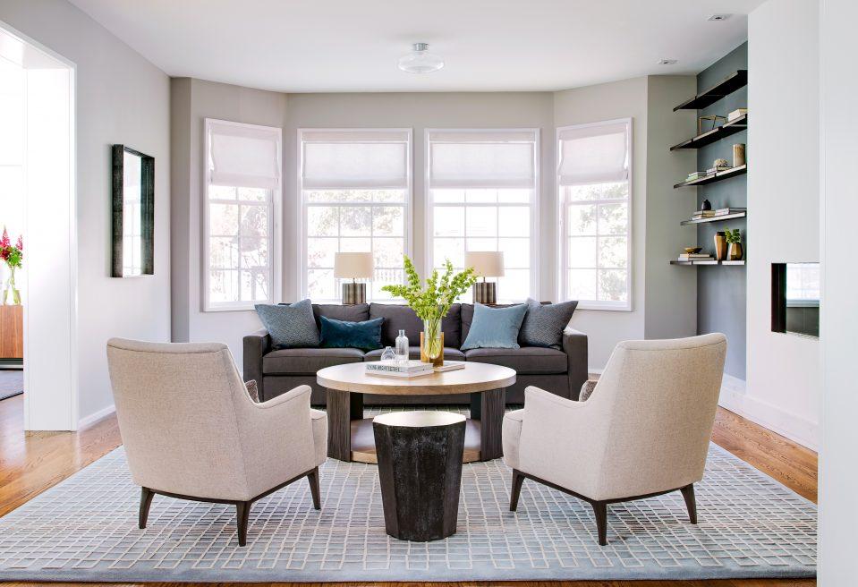 Бежевый, коричневый и белый цвета в интерьере большой гостиной