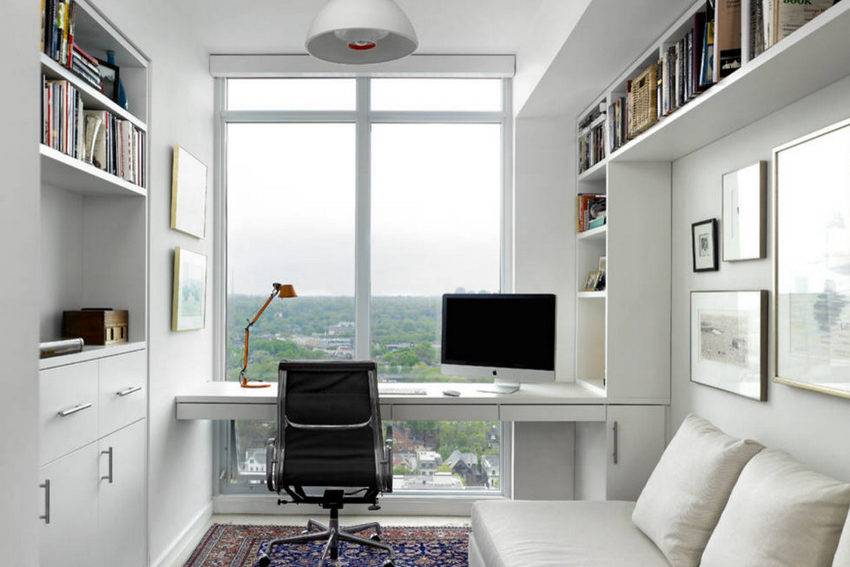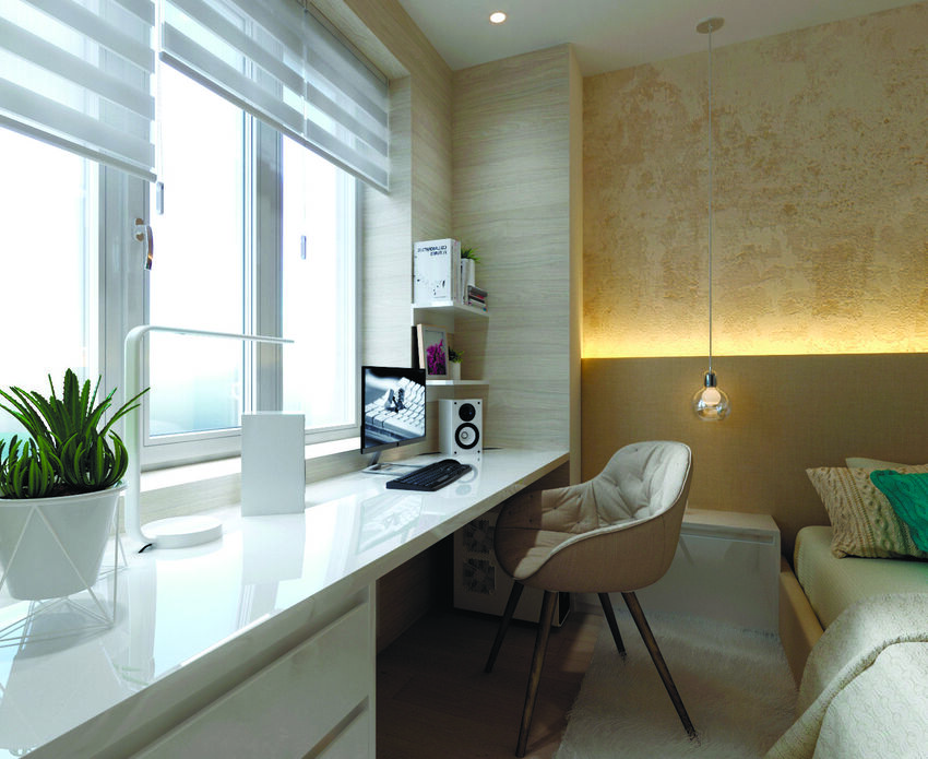 Если имеется застеклённая и утеплённая лоджия, это отличный способ прибавить несколько метров к площади. Традиционно лоджии используются в качестве домашней оранжереи или кладовки, однако, вместо этого там можно устроить зону отдыха, поставив там небольшой диванчик и журнальный столик. При желании на балконе можно разместить рабочий кабинет со столом и компактным книжным стеллажом. Как будет выглядеть дизайн комнаты 18 кв. м со спальней и гостиной, совмещёнными с балконом, можно посмотреть на фото.