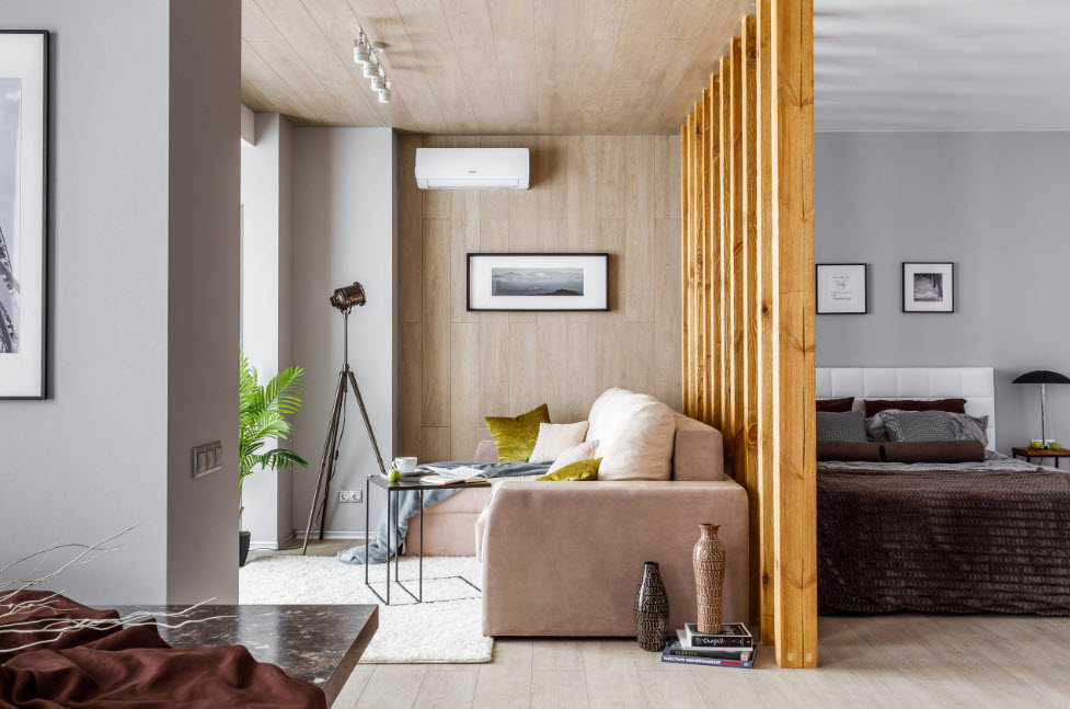 - Гостиная-спальня в одной комнате в 17 кв. м должна включать обязательное зонирование, чтобы спрятать ложе от чужих глаз и обеспечить гостиной необходимый комфорт.