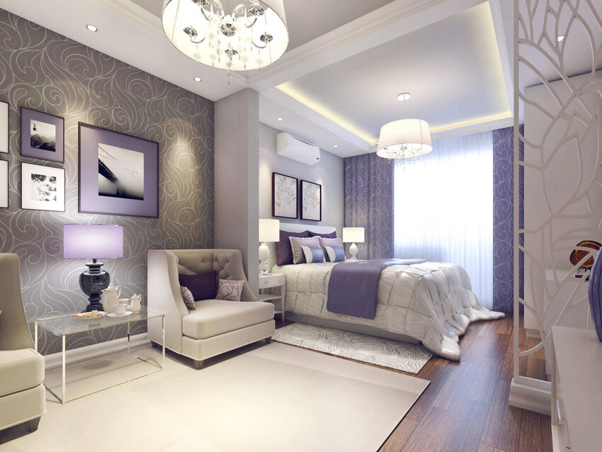 В спальне-гостиной важно использовать различные приемы для увеличения пространства. Это можно сделать путем подбора светлой отделки, отказа от крупных изображений, массивных перегородок, крупных предметов мебели.