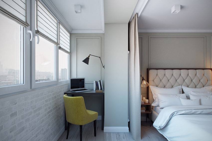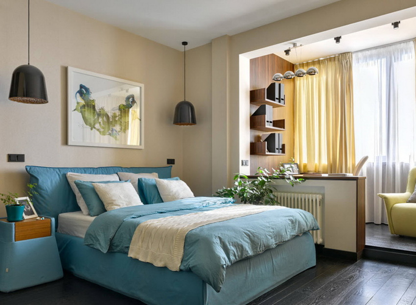 Для увеличения помещения при оформлении спальни-гостиной владельцы могут рассмотреть вариант ее объединения с лоджией при получении соответствующего разрешения. В результате, комната становится более просторной, а в условиях освободившегося пространства можно разместить рабочий стол, оформить гардеробную и т.д.